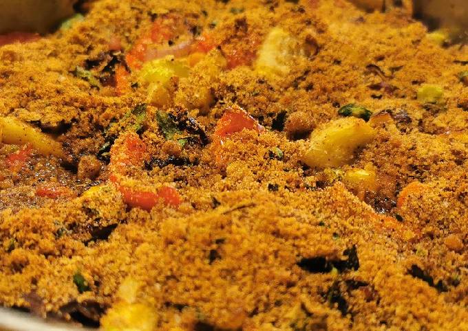 - Nel frattempo in un padella tostate con un cucchiaio d'olio e l'aglio finemente tritato (facoltativo) il pane grattuggiato. Prima del termine della cottura delle verdure (lo si capisca dalla cipolla completamente appassita e dalla melanzana morbida) estraete la teglia e spolverate le verdure con la mollica tostata. Infornare per gli ultimi 7/8 minuti. Servitela tiepida..