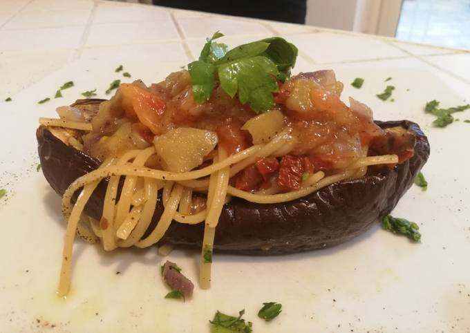 - Prendete con una forchetta le bavettine e adagiate nella barchetta di melanzane con il sughetto e informate una decina di minuti circa con il grill..