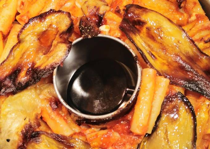 - A questo punto cuocere al dente la pasta,scolarla e condirla con sugo e pezzi di caciocavallo.... Foderare lo stampo da ciambella con le fette di melanzane fritte e inserire metà della pasta, aggiungendo fette di melanzane e formaggio grattugiato e continuare così per un altro strato, infine terminare con fette di melanzane per chiudere il tutto!.