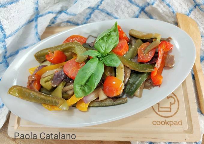 - Preparare una padella da 30 cm tagliare la cipolla e aggiungere l' olio. Unire i peperoni e le zucchine e le melanzane. Salare e coprire. Cuocere per 10 minuti. Controllare la cottura aggiungere se occorre un po' di acqua. Unire i pomodori 5 minuti prima del termine della cottura aggiungere qualche foglia di basilico..